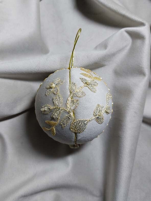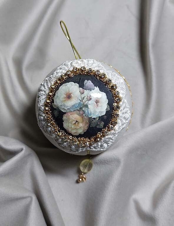 Hele sjieke kerstbal met zacht, warmgrijs fluweel, een afbeelding van mooie rozen en een vlindertje. Het ornament is handgemaakt en versierd met kant en een kettinkje met strass steentjes. De achterzijde is versierd met een uitsnede van kanten stof.